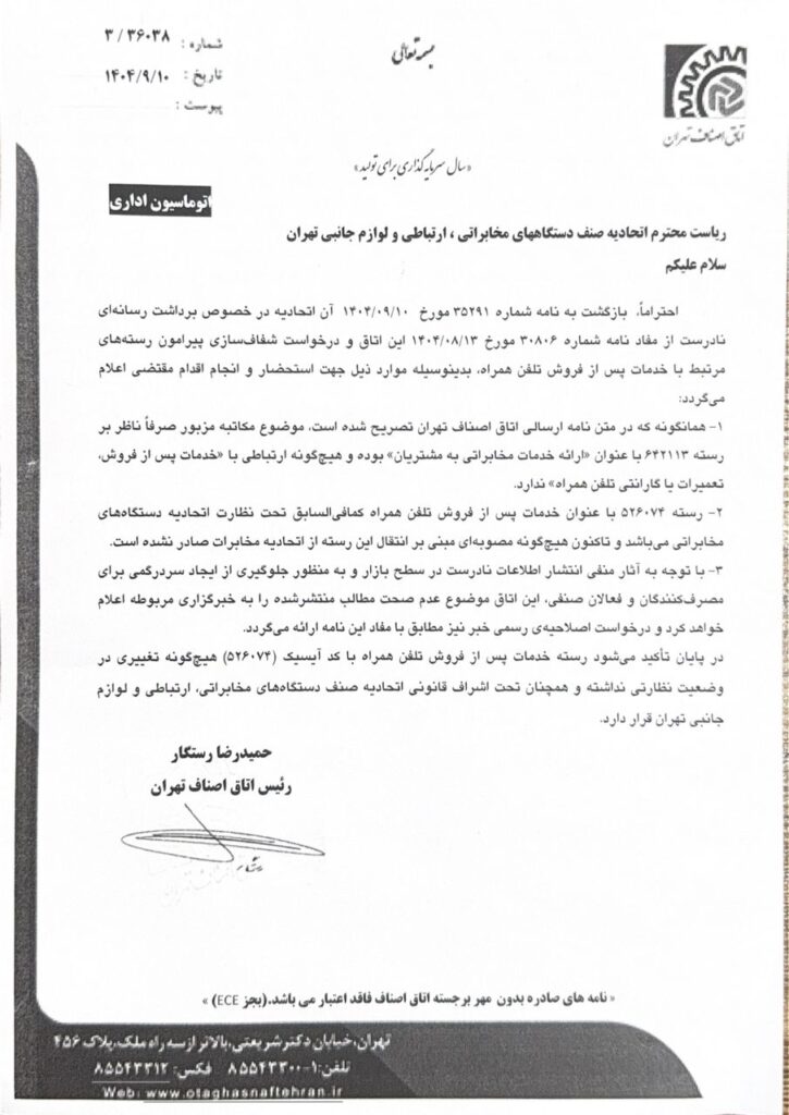 به دنبال انتشار مطالب نادرست و تفاسیر خلاف واقع توسط اتحادیه فروشندگان دستگاههای صوتی، تصویری درباره مفاد نامه شماره ۳۰۸۰۶ مورخ ۱۴۰۴/۰۸/۱۳ و موارد منتسب به «واگذاری خدمات پس از فروش و رجیستری»، و با توجه به پاسخ رسمی اتاق اصناف تهران در نامه شماره ۳۶۰۳۸ مورخ ۱۴۰۴/۰۹/۱۰ که تمامی برداشتهای رسانهای مطرحشده را نادرست اعلام نموده، این اتحادیه بدینوسیله اطلاعیه شماره ۲ را منتشر میکند:
